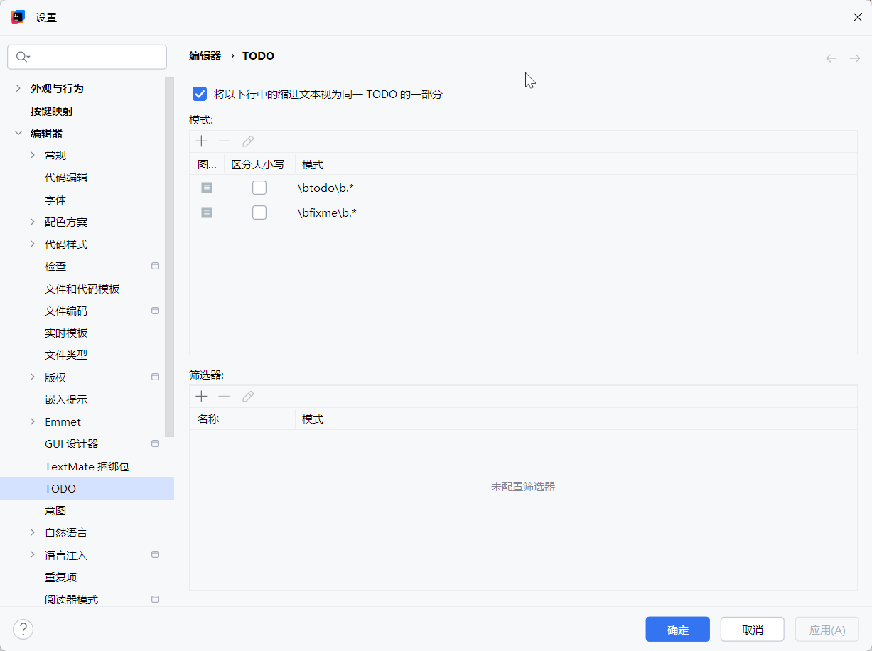你会看到一个 Patterns 列表,里面是当前 IDEA 能识别的“任务注释模式”。